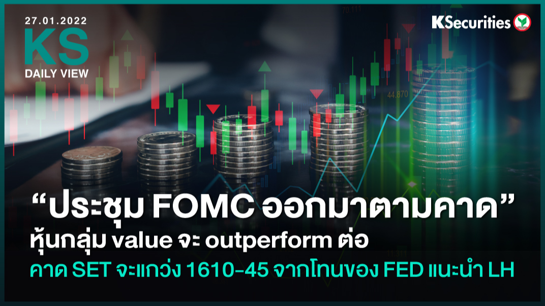 KS Daily View 27.01.2022 >>> การประชุม FOMC เราแบ่งเป็น 3 กรณี / ให้น้ำหนักกรณี 2 จากการประชุม /เหตุการณ์ SPRC มองเป็น Buy on dip / พรีวิวงบ 4Q64 / คาด SET จะแกว่ง 1610-45 จากโทนของ FED แนะนำ LH
