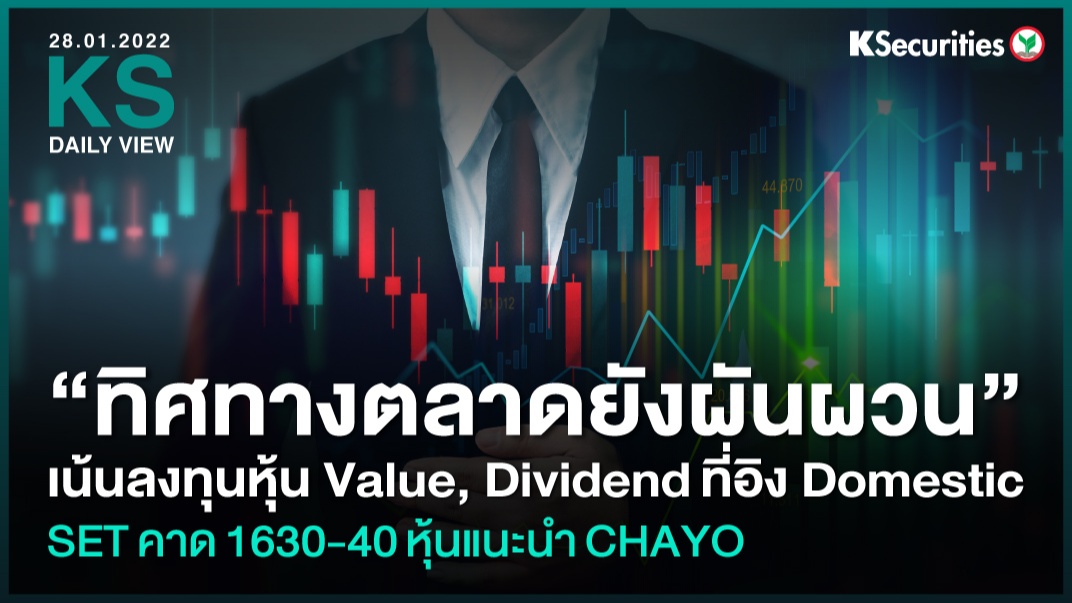 KS Daily View 28.01.2022 >>> ตลาดหุ้นสหรัฐฯและยุโรปยังคงผันผวนสูงหลังการประชุม Fed/ ทิศทางตลาดยังคงผันผวนไรทิศทาง เน้นลงทุนหุ้นกลุ่ม Value, Dividend ที่อ้างอิงการ Domestic เป็นหลัก / SET คาด 1630-40 หุ้นแนะนำ CHAYO