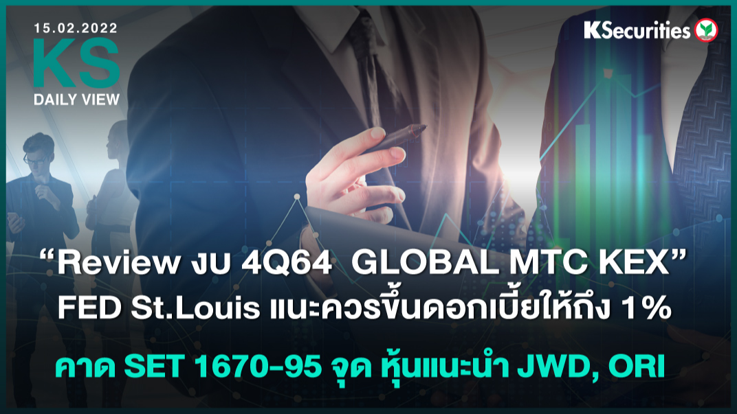 KS Daily View 15.02.2022 >>> ติดตาม FOMC Minutes / FED St.Louis แนะควรขึ้นดอกเบี้ยให้ถึง 1% ภายใน กรกฏานี้ / Review ผลประกอบการ 4Q21 / คาด SET 1670-95 หุ้นแนะนำ JWD, ORI