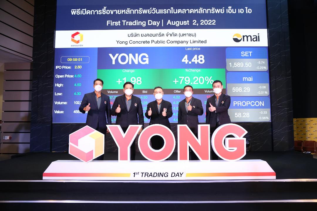แมนพงศ์ เสนาณรงค์ รองผู้จัดการ หัวหน้าสายงานผู้ออกหลักทรัพย์ ตลาดหลักทรัพย์แห่งประเทศไทย ประพันธ์ เจริญประวัติ ผู้จัดการตลาดหลักทรัพย์ เอ็ม เอ ไอ (mai) พร้อมด้วย สรรเพชญ ศลิษฏ์อรรถกร กรรมการผู้จัดการ บริษัท ยงคอนกรีต จำกัด (มหาชน) หรือ YONG และ วรชาติ ทวยเจริญ กรรมการผู้จัดการ บริษัท ฟินเน็กซ์ แอ๊ดไวเซอรี่ จำกัด ที่ปรึกษาทางการเงิน ชนะชัย จุลจิราภรณ์ ประธานเจ้าหน้าที่บริหาร บริษัทหลักทรัพย์ เอเชีย เวลท์ จำกัด ในฐานะผู้จัดการการจัดจำหน่ายและรับประกันการจำหน่าย ร่วมพิธีเปิดการซื้อขายวันแรกในตลาดหลักทรัพย์ mai ของ YONG ผู้ผลิตและจำหน่ายผลิตภัณฑ์คอนกรีตสำเร็จรูป ผลิตภัณฑ์คอนกรีตผสมเสร็จ และให้บริการติดตั้งโครงสร้างสำเร็จรูป หมวดธุรกิจอสังหาริมทรัพย์และก่อสร้าง โดยเปิดเทรดวันแรกที่ 4.50 บาท เพิ่มขึ้น 80% จากราคาจองซื้อ (IPO) ที่ 2.50 บาท/หุ้น