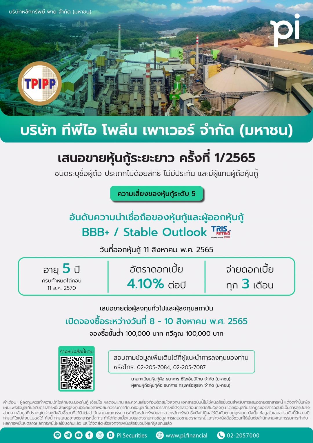 บริษัทหลักทรัพย์ พาย จำกัด (มหาชน) หรือ Pi เปิดดีลขายหุ้นกู้ รับหน้าที่เป็นผู้จัดจำหน่ายหุ้นกู้ระยะยาวของบริษัท ทีพีไอ โพลีน เพาเวอร์ จำกัด (มหาชน) หรือ TPIPP ครั้งที่ 1/2565 ซึ่งมีกำหนดไถ่ถอนครบ 5 ปี หรือในเดือนสิงหาคมปี 2570 อัตราดอกเบี้ยคงที่สูงถึง 4.10% ต่อปี รวมไปถึงมีระยะเวลาจ่ายดอกเบี้ยทุก 3 เดือนตลอดอายุหุ้นกู้ จำนวนเสนอขายรวมหุ้นกู้สำรองไม่เกิน 6,000,000 หน่วย คิดเป็นมูลค่ารวมทั้งสิ้นไม่เกิน 6,000,000,000 บาท (หกพันล้านบาท) โดยมีธนาคาร ซีไอเอ็มไทย จำกัด (มหาชน) เป็นนายทะเบียนหุ้นกู้ และธนาคาร กรุงศรีอยุธยา จำกัด (มหาชน) เป็นผู้แทนผู้ถือหุ้นกู้