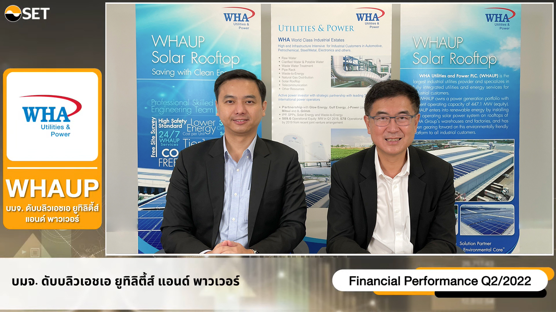 นายสมเกียรติ เมสันธสุวรรณ (ขวา) ประธานเจ้าหน้าที่บริหาร พร้อมด้วย นายประพนธ์ ชินอุดมทรัพย์ (ซ้าย) ประธานเจ้าหน้าที่ฝ่ายบริหารการเงิน บมจ.ดับบลิวเอชเอ ยูทิลิตี้ แอนด์ พาวเวอร์ (“WHAUP”) นำเสนอข้อมูลบริษัทฯ ภายในงานบริษัทจดทะเบียนพบนักลงทุน (Opportunity Day) ณ อาคาร ดับบลิวเอชเอ ทาวเวอร์ ภายหลังประกาศผลการดำเนินงานงวดไตรมาส 2 ปี 2565 มีรายได้และส่วนแบ่งกำไรปกติ 837 ล้านบาท และกำไรปกติ 264 ล้านบาท พร้อมประกาศเดินหน้าลงทุนในธุรกิจสาธารณูปโภค (น้ำ) และธุรกิจไฟฟ้าพลังงานสะอาด ทั้งในประเทศ และต่างประเทศ เพื่อสร้างการเติบโตในอนาคต