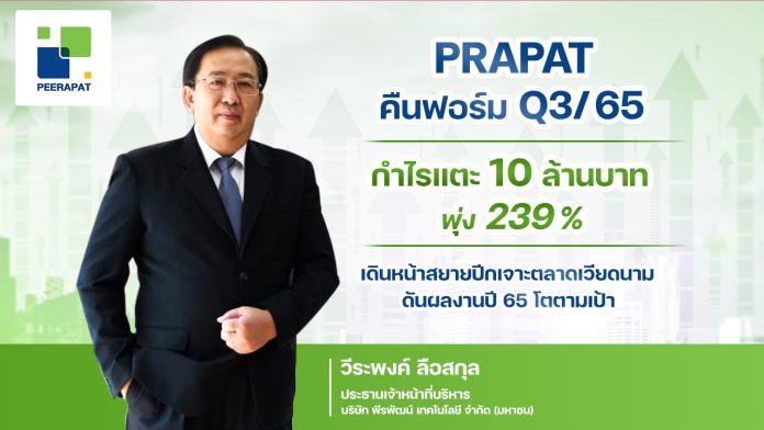 PRAPAT ผลงาน Q3/65 เทียบปีก่อนพลิกมีกำไร 239% โกยรายได้รวมเกิน 250 ล้านบาท โตเกือบ 50% รับอานิสงส์ท่องเที่ยว-โรงแรมฟื้นตัวกลับมาคึกคัก เร่งเสริมทัพสินค้านวัตกรรม Green products รุกคืบต่างประเทศ เน้นลงทุนเวียดนาม แย้มแนวโน้มไตรมาส 4/65 ดีต่อเนื่อง หนุนผลงานปี 65 ตามเป้า