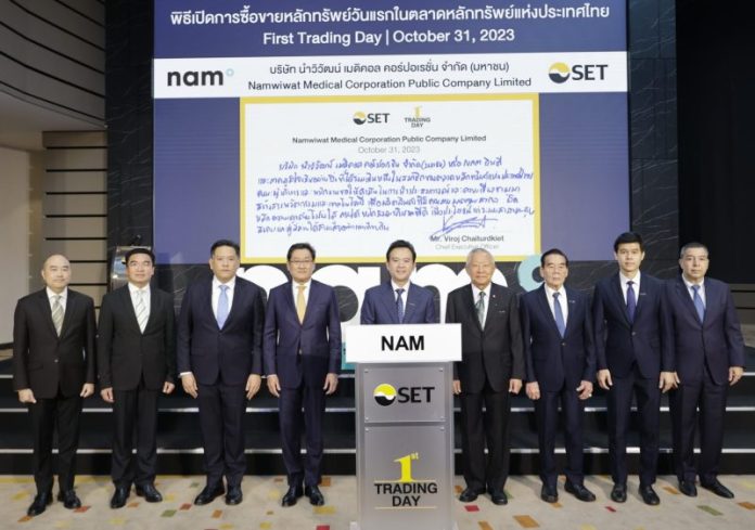 พลเอกวินัย ภัททิยกุล (กลาง) ประธานคณะกรรมการ นายวิชัย ชัยเทอดเกียรติ (ที่ 3 จากขวา) กรรมการบริหาร นายวิโรจน์ ชัยเทอดเกียรติ (ที่ 4 จากขวา) ประธานเจ้าหน้าที่บริหาร นายวิศิษฐ์ ชัยเทอดเกียรติ (ที่ 2 จากขวา) ประธานเจ้าหน้าที่สายงานปฏิบัติการ บริษัท นำวิวัฒน์ เมดิคอล คอร์ปอเรชั่น จำกัด (มหาชน) หรือ NAM ร่วมกับ นายวรชาติ ทวยเจริญ (ที่ 2 จากซ้าย) กรรมการผู้จัดการ บริษัท ฟินเน็กซ์ แอ๊ดไวเซอรี่ จำกัด นายกำพล ทรวงบูรณกุล (ซ้ายสุด) ผู้ช่วยกรรมการผู้จัดการ บริษัทหลักทรัพย์ ธนชาต จำกัด (มหาชน) ในฐานะที่ปรึกษาทางการเงิน และ นายวราห์ สุจริตกุล (ขวาสุด) Chairman บริษัทหลักทรัพย์ ฟินันซ่า จำกัด ในฐานะผู้จัดการการจัดจำหน่ายและรับประกันการจำหน่าย ร่วมพิธีเปิดการซื้อขายหลักทรัพย์ในตลาดหลักทรัพย์แห่งประเทศไทยเป็นวันแรก โดยมี ดร.ภากร ปีตธวัชชัย (ที่ 4 จากซ้าย) กรรมการและผู้จัดการ และ นายแมนพงศ์ เสนาณรงค์ (ที่ 3 จากซ้าย) รองผู้จัดการ ตลาดหลักทรัพย์แห่งประเทศไทย ร่วมแสดงความยินดี ณ อาคารตลาดหลักทรัพย์แห่งประเทศไทย