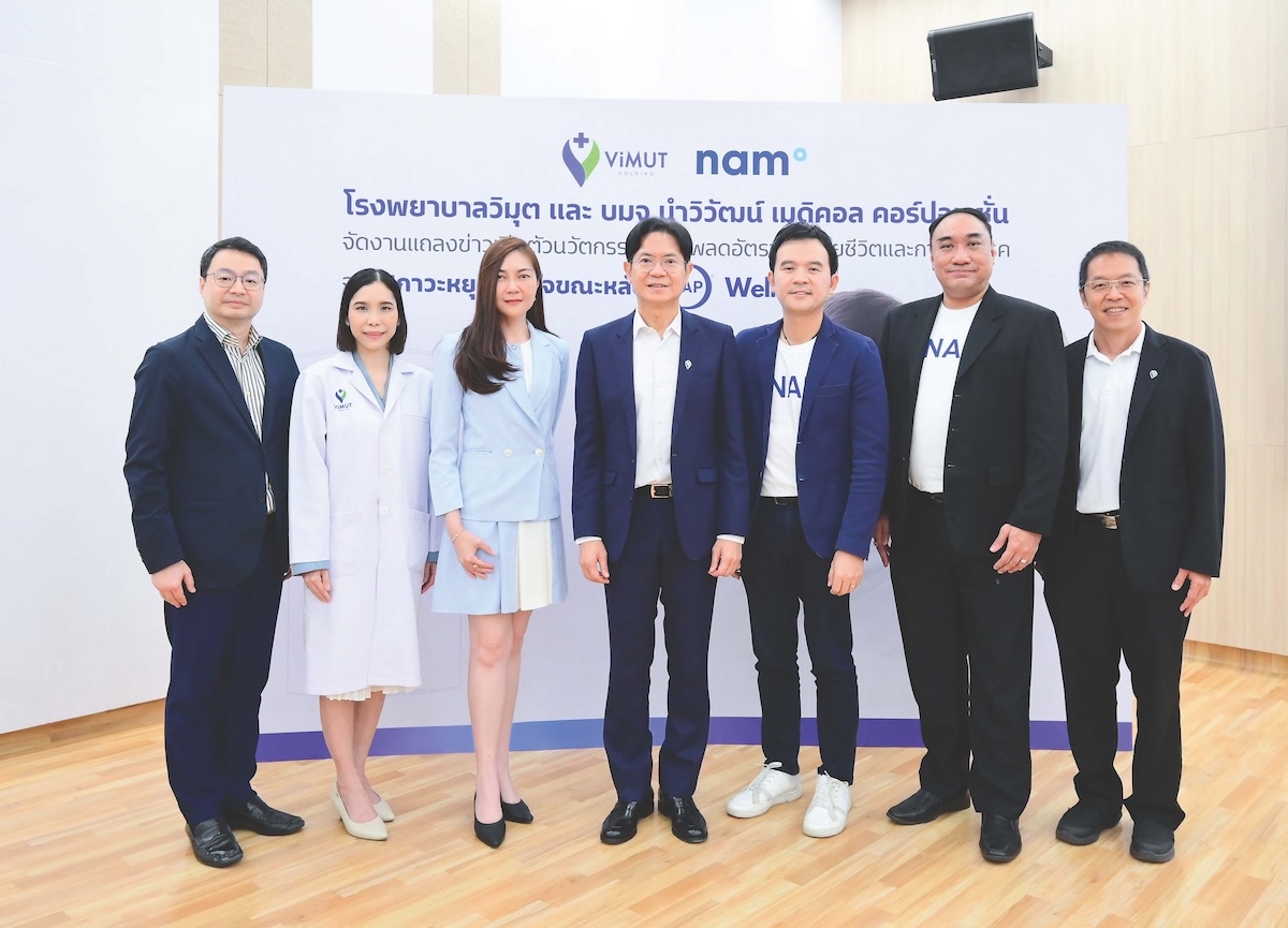 นายแพทย์พิชิต กังวลกิจ (กลาง) รองประธานเจ้าหน้าที่บริหารกลุ่ม บริษัท พฤกษา โฮลดิ้ง จำกัด (มหาชน) และ นายวิโรจน์ ชัยเทอดเกียรติ (ที่ 3 จากขวา) ประธานเจ้าหน้าที่บริหาร บริษัท นําวิวัฒน์ เมดิคอล คอร์ปอเรชั่น จํากัด (มหาชน) หรือ NAM ถ่ายภาพร่วมกันภายหลังงาน “เปิดตัวเทคโนโลยี iNAP” (Intraoral Negative Airway Pressure Therapy) ซึ่งเป็นนวัตกรรมในการรักษาอาการนอนกรน และภาวะหยุดหายใจขณะหลับ อีกทางเลือกในการแก้ปัญหาและเพิ่มคุณภาพการนอนหลับ ที่ได้รับการทดสอบและรับรองจากสำนักงานคณะกรรมการอาหารและยา (อย.) ในประเทศไทย รวมทั้งผ่านการรับรองจากองค์การอาหารและยาสหรัฐ (US-FDA) และในประเทศไต้หวัน ทั้งนี้ถือเป็นการตอกย้ำความมุ่งมั่นของ รพ. วิมุต ในการเป็นผู้นำด้าน Trusted Healthcare Platform นำเทคโนโลยีทางการแพทย์เข้ามายกระดับการดูแลรักษาและให้บริการครอบคลุมอย่างไร้รอยต่อ โดยงานดังกล่าวจัดขึ้น ณ ห้องประชุมใหญ่ ชั้น 10 โรงพยาบาลวิมุต เมื่อเร็วๆ นี้