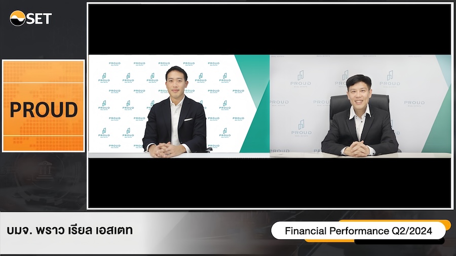 นายพสุ ลิปตพัลลภ (ซ้าย) กรรมการบริหาร และ นายภูมิพัฒน์ สินาเจริญ (ขวา) ประธานเจ้าหน้าที่บริหาร บริษัท พราว เรียล เอสเตท จำกัด (มหาชน) หรือ PROUD ให้ข้อมูลผลประกอบการครึ่งปีแรก 2567 รายได้รวม 1,784 ล้านบาท กำไรสุทธิ 89 ล้านบาท พร้อมเดินหน้าตามแผนงาน หลังย้ายหลักทรัพย์เข้าตลาดฯ SET ย้ำความแข็งแกร่ง ในงานบริษัทจดทะเบียนพบผู้ลงทุน (Opportunity Day) จัดโดยตลาดหลักทรัพย์แห่งประเทศไทย สามารถรับชมบันทึกเทปได้ที่ www.set.or.th/streaming/vdos-oppday