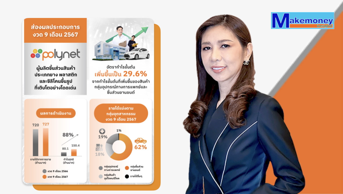 บริษัท โพลีเน็ต จำกัด (มหาชน) หรือ POLY ผู้นำด้านธุรกิจผลิตชิ้นส่วนสินค้าประเภทยาง พลาสติก และซิลิโคนขึ้นรูปตามความต้องการของลูกค้า ตอกย้ำความสำเร็จอย่างต่อเนื่องหลังเผยผลประกอบการงวด 9 เดือนแรก 2567 (ม.ค.-ก.ย.) มีรายได้จากการขายรวม 727 ล้านบาท เติบโตขึ้น 1.1% จากปีก่อนหน้า ขณะที่กำไรสุทธิเพิ่มเป็น 150.4 ล้านบาท หรือเพิ่มขึ้น 88% จากช่วงเดียวกันของปีก่อน