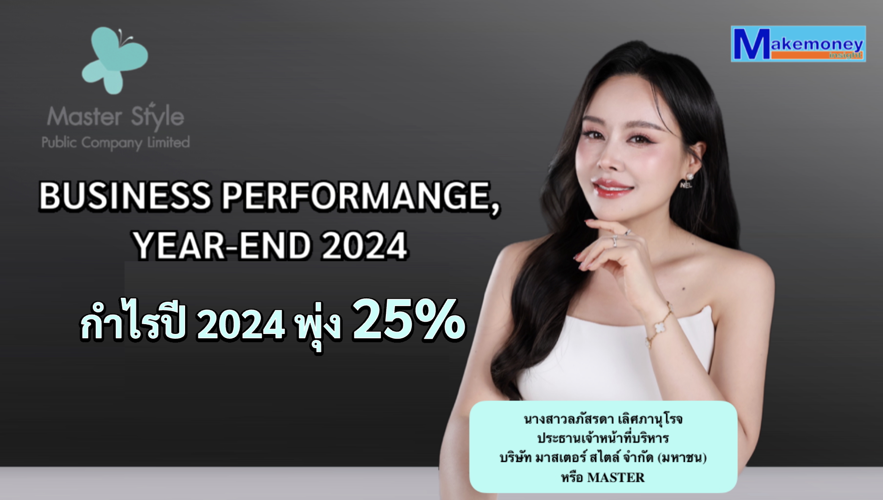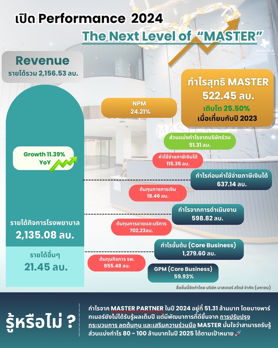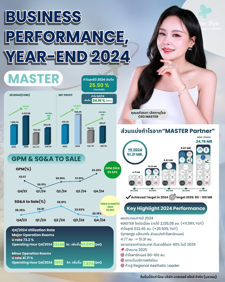 นางสาวลภัสรดา เลิศภานุโรจ ประธานเจ้าหน้าที่บริหาร บริษัท มาสเตอร์ สไตล์ จำกัด (มหาชน) หรือ MASTER ในนามโรงพยาบาลมาสเตอร์พีช ผู้นำอันดับต้นของอุตสาหกรรมด้านความงามในไทยและเอเชียในฐานะ Regional Company กล่าวว่า รายงานผลการดำเนินงานประจำปี 2567 มีกำไรสุทธิ อยู่ที่ 522.45 ล้านบาท เพิ่มขึ้น 25% จากปี 2566 ที่มีกำไรอยู่ที่ 416.29 ล้านบาท เป็นผลมาจากรายได้จากการประกอบกิจการโรงพยาบาล ทำได้ 2,135 ล้านบาท เพิ่มขึ้นจากปี 2566 ที่มีรายได้อยู่ที่ 1,916 ล้านบาท โดยรายได้จากการศัลยกรรมเพิ่มขึ้น ทั้งในส่วนของรายได้จากหัตถการ ศัลยกรรมยกคิ้ว ศัลยกรรมหน้า และสุขภาพชาย รวมถึงรายได้จากการปลูกผมและดูแลเส้นผม นอกจากนี้ บริษัทฯ มีการทำการตลาดในต่างประเทศเพิ่มมากขึ้น ทำให้มีลูกค้าต่างประเทศ โดยเฉพาะจากประเทศ อินโดนีเชีย เมียนมา จีน เข้ามาใช้บริการ ส่งผลให้รายได้จากการศัลยกรรมความงามปรับตัวเพิ่มขึ้น