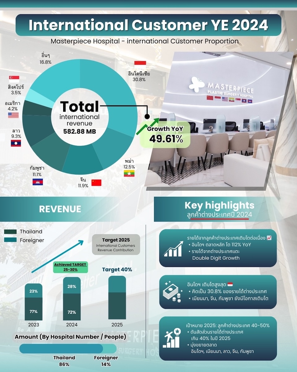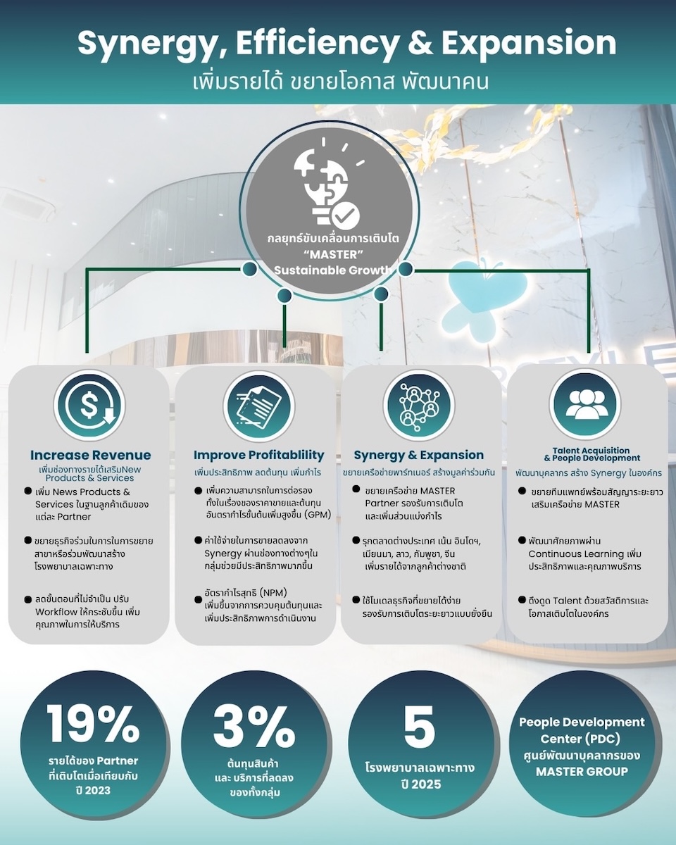 นางสาวลภัสรดา กล่าวทิ้งท้ายว่า เป้าหมายในปี 2568 บริษัทฯ วางแผนรุกขยายตลาดต่างประเทศมากขึ้น เพื่อผลักดันสัดส่วนรายได้จากต่างประเทศเพิ่มเป็น 40% โดยเน้นการขยายฐานลูกค้าไปยัง อินโดนีเซีย เมียนมา ลาว จีน และกัมพูชา ซึ่งเป็นตลาดที่มีความต้องการด้านศัลยกรรมความงามสูง นอกจากนี้ MASTER ยังให้ความสำคัญกับการยกระดับมาตรฐานบริการและประสบการณ์ลูกค้า โดยมุ่งสู่การเป็น Regional Aesthetic Leader หรือผู้นำด้านศัลยกรรมความงามในระดับภูมิภาค