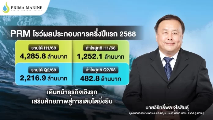 บริษัท พริมา มารีน จำกัด (มหาชน) หรือ PRM และกลุ่มบริษัทย่อย แจ้งผลการดำเนินงานสำหรับไตรมาส 2 สิ้นสุดวันที่ 30 มิถุนายน 2568 รวมถึงภาพรวมผลประกอบการครึ่งแรกของปี 2568 โดยบริษัทฯ ยังคงเดินหน้าขยายการลงทุนในธุรกิจหลัก เพื่อเสริมสร้างความแข็งแกร่งและโอกาสในการเติบโตในระยะยาวอย่างต่อเนื่อง