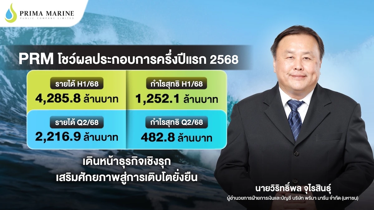 นายวิริทธิ์พล จุไรสินธุ์ ผู้อำนวยการฝ่ายการเงินและบัญชี บริษัท พริมา มารีน จำกัด (มหาชน) เปิดเผยว่า ในไตรมาส 2/2568 บริษัทฯ มีรายได้จากการให้บริการรวม 2,216.9 ล้านบาท และมีกำไรสุทธิ 482.8 ล้านบาท และ 6 เดือนแรกของปี 2568 บริษัทฯ มีรายได้จากการให้บริการ 4,285.8 ล้านบาท และมีกำไรสุทธิ 1,252.1 ล้านบาท