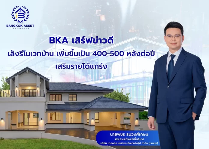 นายพชร ธนวงศ์เกษม ประธานเจ้าหน้าที่บริหาร บริษัท บางกอก แอสเซท อินเตอร์กรุ๊ป จำกัด (มหาชน) หรือ BKA ผู้นำบริการซื้อ-ขายบ้านมือสองตกแต่งใหม่ เปิดเผยว่า ภายหลังจากได้ลงนามบันทึกข้อตกลงความร่วมมือทางธุรกิจ (MOU) กับพันธมิตรทั้ง บริษัทบริหารสินทรัพย์ กรุงเทพพาณิชย์ จำกัด (มหาชน) หรือ BAM และ ธนาคารยูโอบี จำกัด (มหาชน) (UOB) เพื่อพลิกทรัพย์ร้างเป็นทรัพย์สร้างกำไรในช่วงที่ผ่านมา ล่าสุด BKA ได้รับทรัพย์มาดำเนินการเพื่อเป็นต้นแบบของโมเดลแล้วเบื้องต้น 1 ล็อต และคาดว่าจะเพิ่มขึ้นอย่างต่อเนื่องในอนาคตจะขยายเพิ่มขึ้นเป็น 50-100 รายการต่อปี