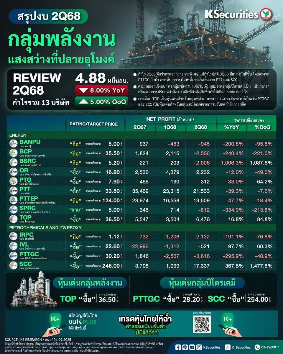 - กำไรไตรมาส 2/2568 ดีกว่าคาด 50% กำไรรวมไตรมาส 2/2568 ของบริษัทกลุ่มพลังงานและปิโตรเคมี 13 แห่งภายใต้การวิเคราะห์ของเราอยู่ที่ 4.88 หมื่นลบ. ลดลง 8% YoY แต่เพิ่มขึ้น 5% QoQ สูงกว่าที่เราคาดการณ์ไว้ 50% สาเหตุหลักมาจากการรับรู้กำไรพิเศษที่เกี่ยวข้องกับ Chandra Asri (CAP) และการซื้อหุ้นคืนหุ้นกู้ของ SCC และ TOP ตามลำดับ โดยกำไรไตรมาส 2/2568 ที่น่าผิดหวังที่สุดคือ BANPU OR SPRC และ IVL ผลประกอบการเหล่านี้บ่งชี้ว่า 1) อุตสาหกรรมพลังงานและปิโตรเคมีจะยังคงอยู่ในช่วงที่ยากลำบาก 2) รายการพิเศษเป็นปัจจัยขับเคลื่อนกำไรของทั้ง 2 กลุ่มธุรกิจนี้ และ 3) กำไรของบริษัทน้ำมันต้นน้ำ กลุ่มบริษัทขนาดใหญ่ และบริษัทค้าปลีกน้ำมันยังคงเป็นบวก แม้จะมีปัจจัยความไม่แน่นอนสูง