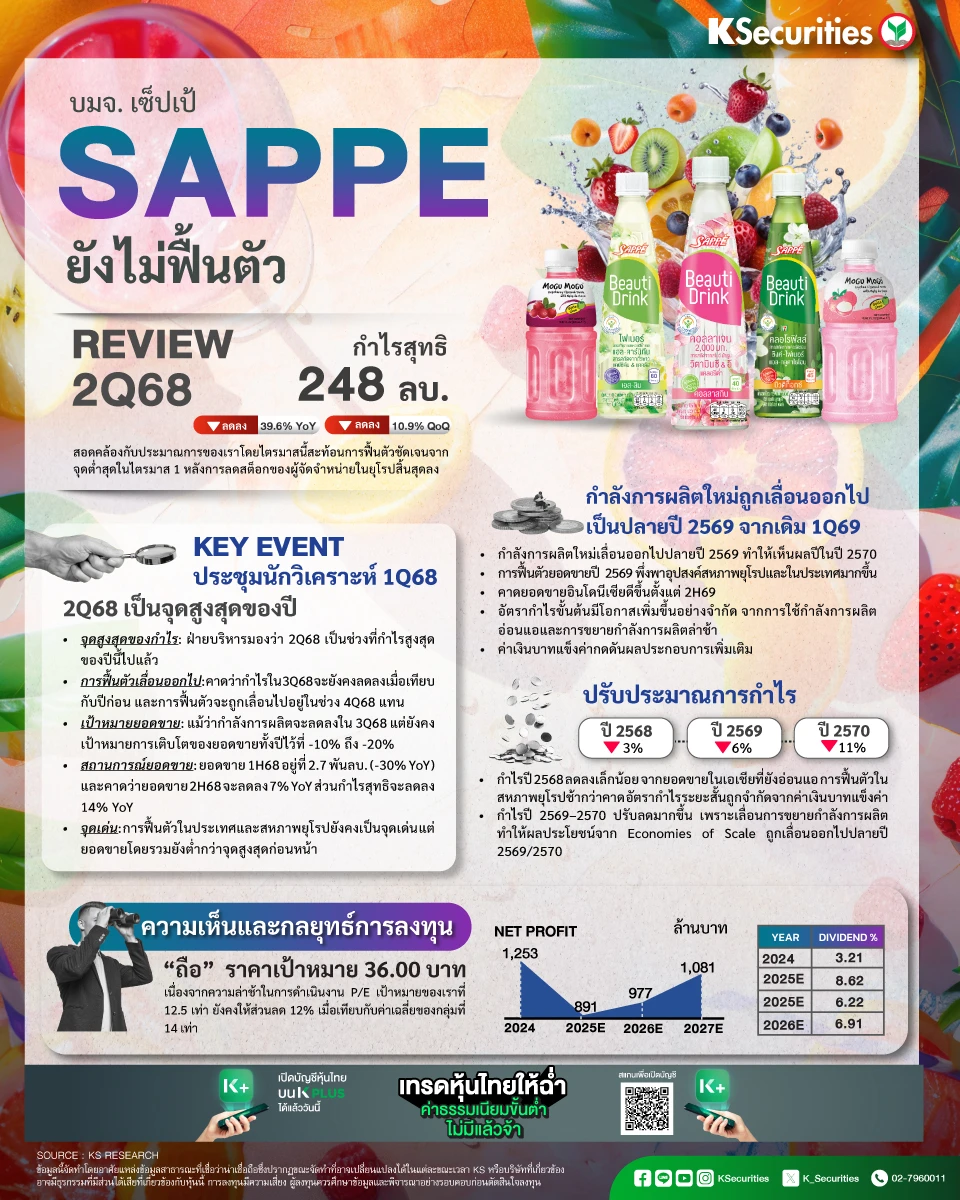 - แนะนำ “ถือ” TP ที่ 36.00 บาท หลังปรับลดประมาณการกำไรปี 2568/2569/2570 ลง ราคาเป้าหมายของเรายังคงใช้ P/E ที่ 12.5 เท่า ต่ำกว่าค่าเฉลี่ยของอุตสาหกรรมที่ 14 เท่า เพื่อสะท้อนความเสี่ยงของยอดขายที่อาจไม่เป็นตามคาดแม้การแก้ไขปัญหาการลดสต็อกสินค้าในสหภาพยุโรปซึ่งเป็นปัจจัยกดดันราคาหุ้นมาตั้งแต่ไตรมาส 3/2567 จะจบไปแล้ว อย่างไรก็ตาม SAPPE มี อัตราผลตอบแทนจากเงินปันผลที่น่าสนใจ, ROE ที่แข็งแกร่ง, และงบดุลที่เป็นเงินสดสุทธิ รวมถึงโครงการซื้อหุ้นคืน