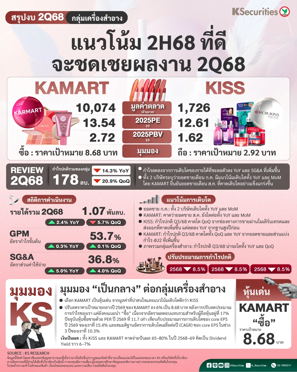 - แนวโน้ม จากการพูดคุยครั้งล่าสุดกับทางผู้บริหาร ทั้ง 2 บริษัทระบุว่ายอดขายเดือน ก.ค. ยังคงเติบโตทั้ง YoY และ MoM ขณะที่ KAMART ระบุว่ายอดขายเดือน ส.ค. มีแนวโน้มที่จะเติบโตทั้ง YoY และ MoM เช่นกัน สำหรับ KISS เราคาดว่ากำไรปกติไตรมาส 3/2568 น่าจะเติบโต QoQ ตามยอดขายที่เพิ่มขึ้นจากการขยายช่องทางการค้าโมเดิร์นเทรดและยอดส่งออกที่คาดสูงขึ้น แต่อาจลดลง YoY จากฐานที่สูงในปีที่แล้ว สำหรับ KAMART เราคาดว่ากำไรปกติไตรมาส 3/2568 น่าจะฟื้นตัว QoQ และเพิ่มขึ้น YoY จากยอดขายและส่วนแบ่งกำไรที่เพิ่มขึ้นจาก 4U2 ซึ่งน่าจะช่วยเพิ่มการประหยัดต่อขนาดให้ดีขึ้น ดังนั้น กำไรปกติรวมไตรมาส 3/2568 ของกลุ่มเครื่องสำอางจึงน่าจะเติบโตทั้ง YoY และ QoQ