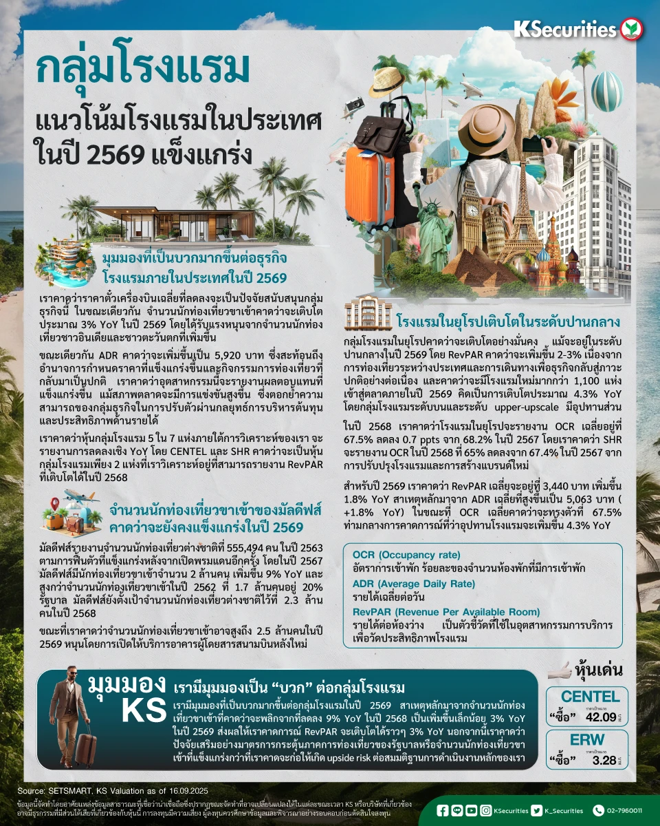 - เรามีมุมมองที่เป็นบวกมากขึ้นต่อกลุ่มโรงแรมในปี 2569 จากจำนวนนักท่องเที่ยวขาเข้าคาดว่าจะพลิกจากที่ลดลง 9% YoY ในปี 2568 เป็นเพิ่มขึ้นเล็กน้อยที่ 3% YoY ในปี 2569 ส่งผลให้ RevPAR เติบโตที่ประมาณ 3% YoY ขณะเดียวกัน เราคาดว่าการดำเนินงานของโรงแรมในต่างประเทศจะยังคงแข็งแกร่ง