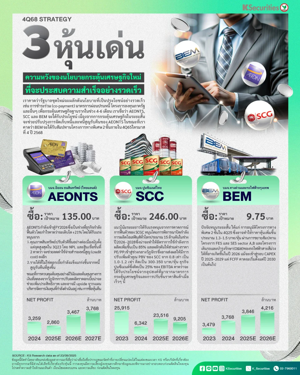 • AEONTS กำลังเข้าสู่ FY2026 ซึ่งเป็นช่วงที่ธุรกิจกำลังฟื้นตัว โดยกำไรคาดว่าจะเติบโต +21% โดยได้รับแรงหนุนจาก