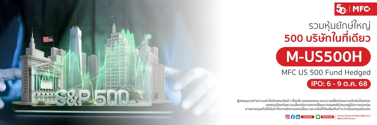 กองทุน M-US500H เปิดเสนอขายครั้งแรก (IPO) ระหว่างวันที่ 6-9 ตุลาคม 68 นี้ เงินลงทุนขั้นต่ำเพียง 1,000 บาท ทั้งนี้ กองทุนมีระดับความเสี่ยง 6 ผู้ลงทุนควรทำความเข้าใจลักษณะสินค้า เงื่อนไข ผลตอบแทน และความเสี่ยงก่อนการตัดสินใจลงทุน กองทุนป้องกันความเสี่ยงอัตราแลกเปลี่ยนตามดุลยพินิจของผู้จัดการกองทุน อาจขาดทุนหรือได้รับกำไรจากอัตราแลกเปลี่ยน และ/หรือได้รับเงินคืนต่ำกว่าเงินลงทุนเริ่มแรก ผู้ที่สนใจสอบถามข้อมูลและขอรับหนังสือชี้ชวน ได้ที่ บลจ.เอ็มเอฟซี จำกัด (มหาชน) และตัวแทนสนับสนุนการขาย หรือ โทรศัพท์ 0-2649-2000 ติดต่อฝ่ายวางแผนการลงทุน กด 2 หรือ Contact Center กด 0 สาขา แจ้งวัฒนะ โทร.0-2835-3055-57 สาขาปิ่นเกล้า โทร.0-2014-3150-2 สาขาขอนแก่น โทร.043-204-014-16 สาขาเชียงใหม่ โทร.0-5321-8480-82 สาขาระยอง โทร.033-100-340 สาขาหาดใหญ่ โทร.074-232-324-25 หรือที่ www.mfcfund.com