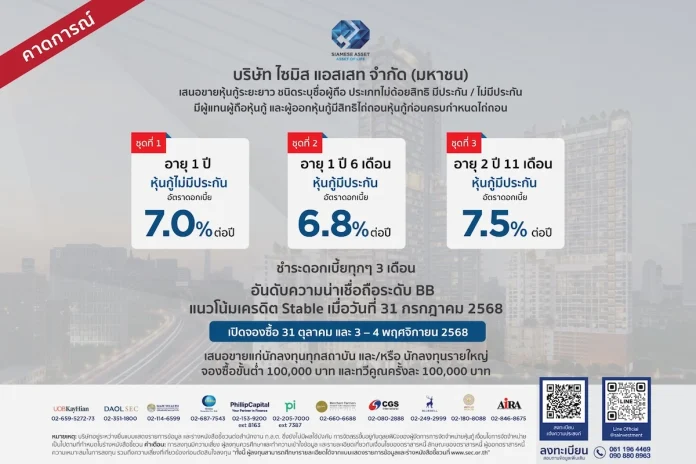 บมจ.ไซมิส แอสเสท (SA) ประสบความสำเร็จในการระดมทุนหุ้นกู้อย่างต่อเนื่อง สะท้อนนักลงทุนและสถาบันให้ความเชื่อมั่น พร้อมเติบโตไปด้วยกัน ล่าสุดเตรียมเสนอขายหุ้นกู้ 3 ชุดใหม่ มีทั้งแบบหุ้นกู้มีหลักประกันและไม่มีประกัน ชูอัตราดอกเบี้ยสูงสุด 7.5% ต่อปี ชำระดอกเบี้ยทุก 3 เดือน คาดเปิดให้จองซื้อระหว่างวันที่ 31 ต.ค. และ 3–4 พ.ย. 68 ฟาก “คุณมณเฑียร” กระซิบว่าโอนกรรมสิทธิ์ 2 โครงการแลนด์มาร์คปลายปีนี้ถึงต้นปีหน้า ตอกย้ำกลยุทธ์ “Asset of Life” มุ่งสร้างกำไรให้ชีวิตทั้งด้านการอยู่อาศัยและการลงทุน