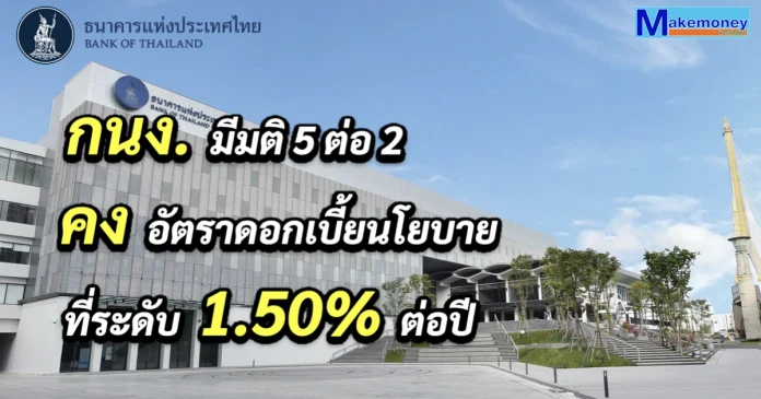 คณะกรรมการฯ มีมติ 5 ต่อ 2 เสียงให้คงอัตราดอกเบี้ยนโยบายไว้ที่ร้อยละ 1.50 ต่อปี ทั้งนี้ 2 เสียงให้ลดอัตราดอกเบี้ยนโยบายร้อยละ 0.25 จากร้อยละ 1.50 เป็นร้อยละ 1.25