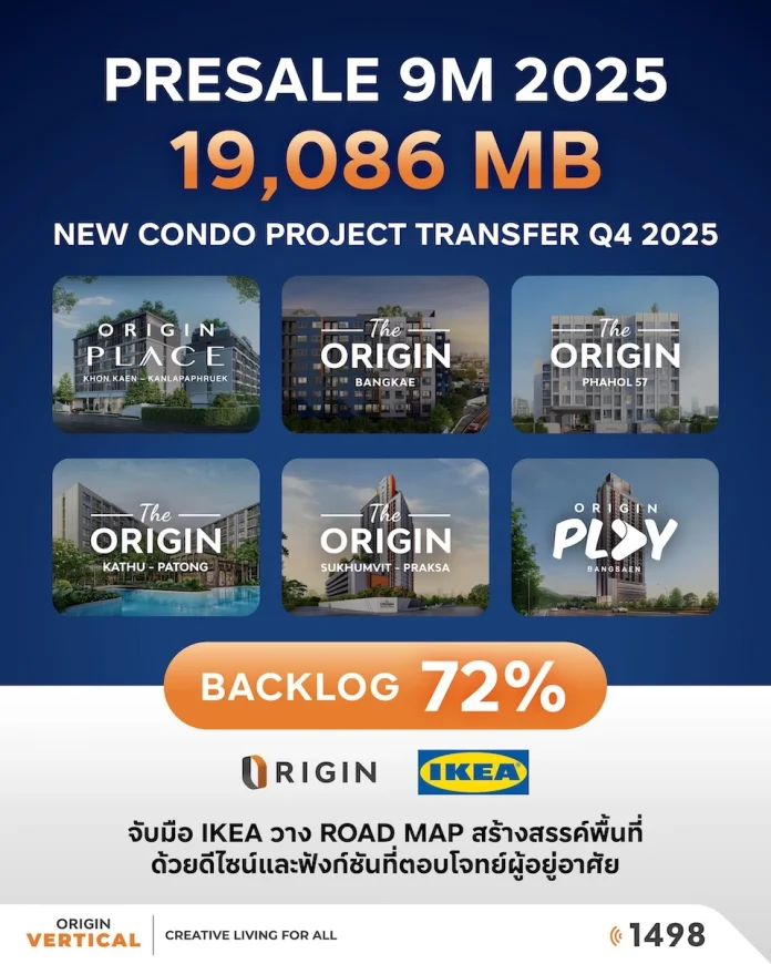 บริษัทฯ มีโครงการคอนโดฯ ที่เสร็จใหม่และเริ่มทยอยโอนกรรมสิทธิ์ ในช่วงไตรมาส 4/2568 จำนวน 6โครงการ คือ ออริจิ้น เพลส ขอนแก่น กัลปพฤกษ์, ดิ ออริจิ้น บางแค, ดิ ออริจิ้น พหล57, ดิ ออริจิ้น กะทู้ – ป่าตอง, ดิ ออริจิ้น สุขุมวิท แพรกษา และ ออริจิ้น เพลย์ บางแสน ซึ่งมีแบ็คล็อคคอนโดฯรวมแล้วกว่า72% ของมูลค่าโครงการ ขณะเดียวกันกลุ่มบริษัทฯ ได้ร่วมมือกับอิเกีย ประเทศไทย แบรนด์เฟอร์นิเจอร์ และของแต่งบ้านระดับโลก (Global Brand) ร่วมสร้างสรรค์พื้นที่อยู่อาศัย ตอบโจทย์ทุกมิติการใช้ชีวิตของคนรุ่นใหม่ คิกออฟโครงการแรก Origin Plug & Play E22 Station คอนโดใหม่เลี้ยงสัตว์ได้ ติด BTS สายสีเขียว สถานีสายลวด เพียงแค่ 0 เมตร* พร้อมเตรียมแผนขยายห้องแต่ง Ready to move อีกหลายโครงการ หลายทำเลศักยภาพทั้งในกรุงเทพ และต่างจังหวัด