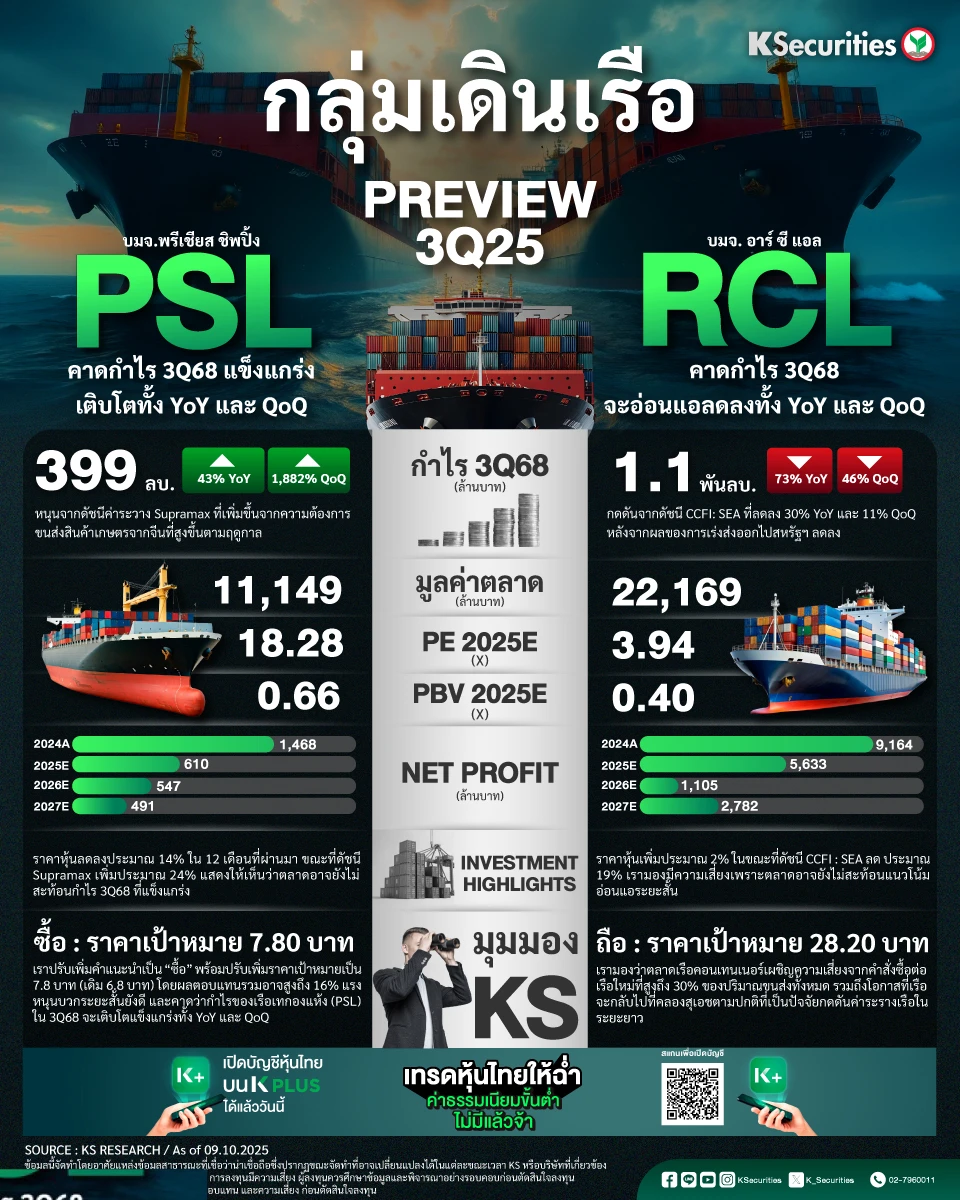 - คาดว่า PSL จะรายงานกำไรปกติแข็งแกร่งในไตรมาส 3/2568 ที่ 399 ลบ. เพิ่มขึ้น 43% YoY และ 18 เท่า QoQ หนุนจากดัชนีค่าระวางเรือ Supramax ที่ปรับขึ้น 39% QoQ จากการส่งออกสินค้าเกษตรของจีน