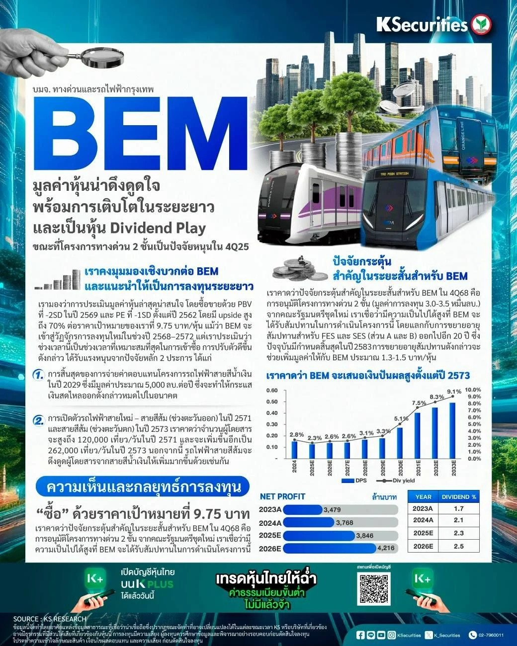 มุมมอง KS : แนะนำ “ซื้อ” เราคงคำแนะนำ “ซื้อ” BEM และราคาเป้าหมายสิ้นปี 2568 ที่ 9.75 บาท เราคาดว่าปัจจัยกระตุ้นสำคัญในระยะสั้นสำหรับ BEM ใน 4Q25 คือการอนุมัติโครงการทางด่วน 2 ชั้น (มูลค่าการลงทุน 3.0-3.5 หมื่นลบ.) จากคณะรัฐมนตรีชุดใหม่ เราเชื่อว่ามีความเป็นไปได้สูงที่ BEM จะได้รับสัมปทานในการดำเนินโครงการนี้