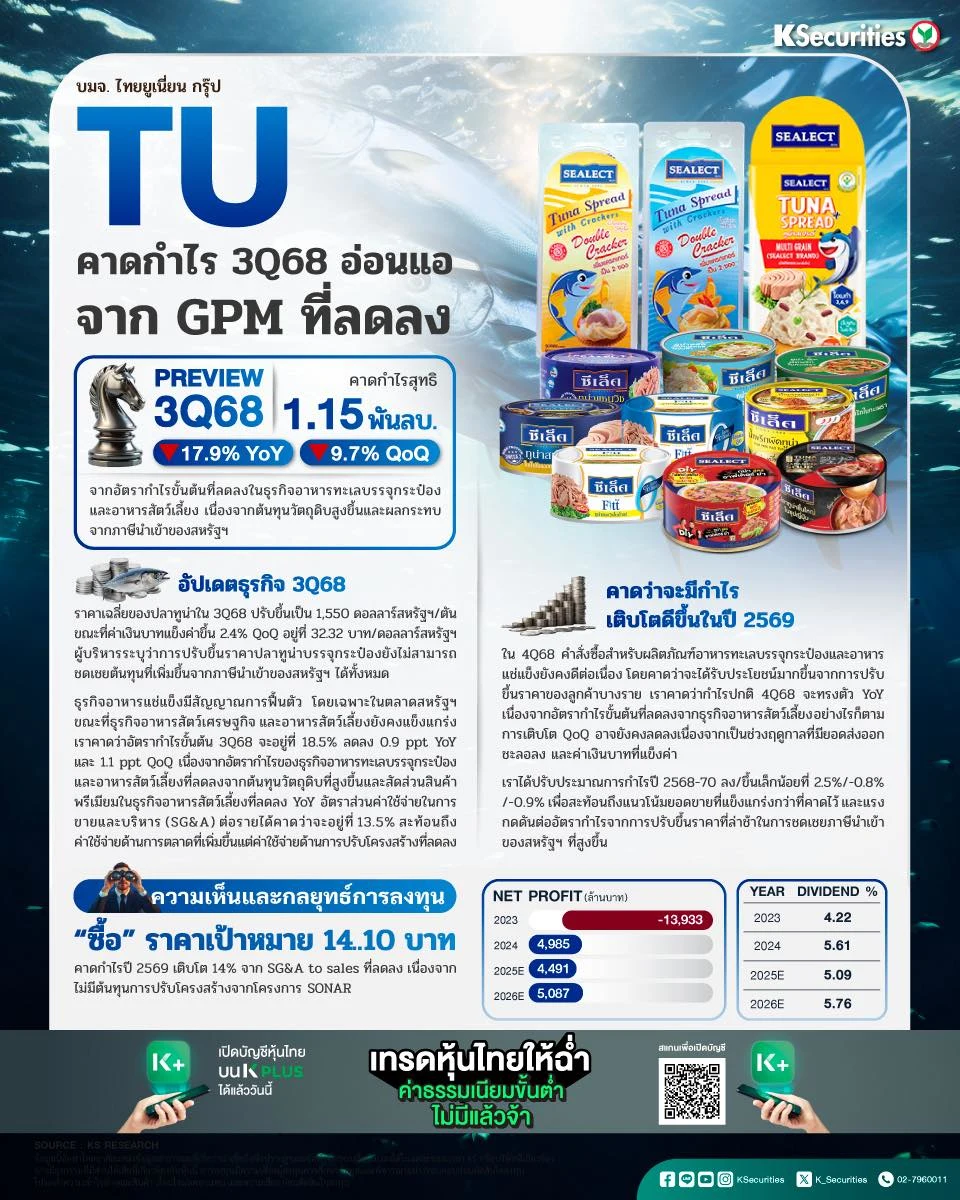 TU คาดกำไร 3Q68 อ่อนแอจาก GPM ที่ลดลง