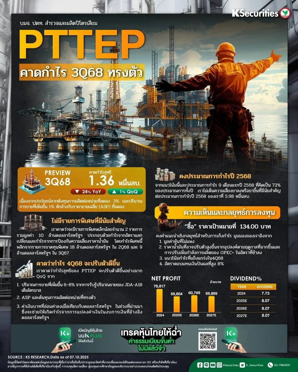 PTTEP คาดกำไร 3Q68 จะอยู่ที่ 1.36 หมื่นลบ. เพิ่มขึ้น 1% QoQ คงคำแนะนำเชิงกลยุทธ์เก็งกำไรหุ้น PTTEP ช่วง 3 เดือนข้างหน้าจาก 1) มูลค่าหุ้นที่ไม่แพง โดยซื้อขายเกือบ -2SD PBV 2) ราคาน้ำมันอาจปรับตัวสูงขึ้นจากอุปสงค์ตามฤดูกาลและการปรับเพิ่มกำลังการผลิต OPEC+ ในอัตราที่ช้าลง 3) แนวโน้มกำไรที่แข็งแกร่งใน 4Q68 จากการเติบโตของปริมาณการขายที่สูง 4) อัตราตอบแทนเงินปันผลที่สูง 8%