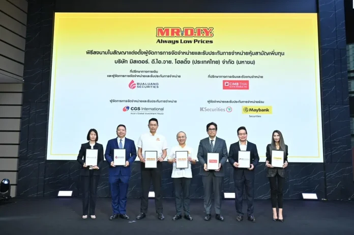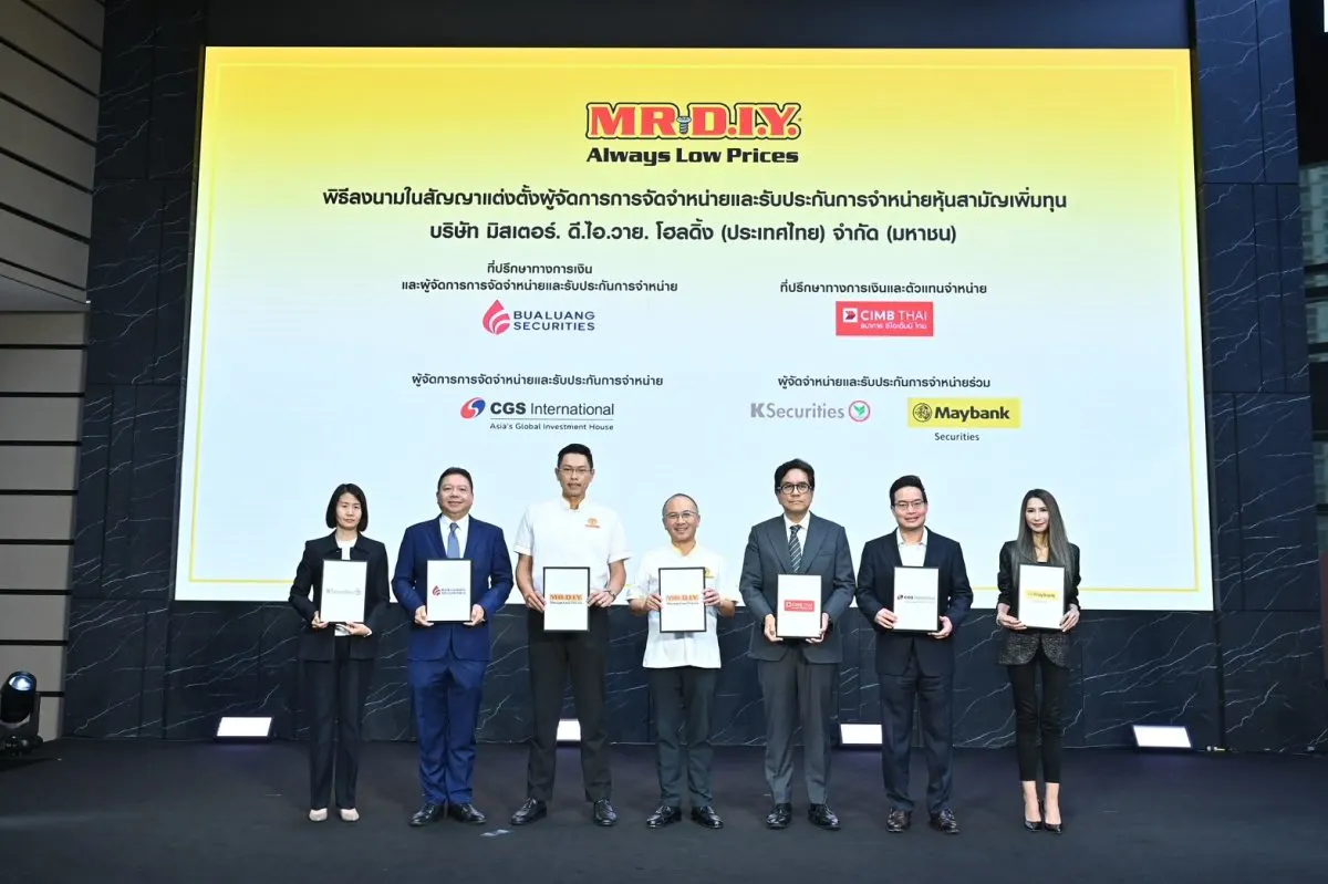 นายเอเดรียน ออง (ที่ 4 จากซ้าย) ประธานกรรมการ นายแอนดี้ ชิน กวานกุ้ย (ที่ 3 จากซ้าย) ประธานเจ้าหน้าที่บริหาร บริษัท มิสเตอร์. ดี.ไอ.วาย. โฮลดิ้ง (ประเทศไทย) จำกัด (มหาชน) หรือ MRDIYT พร้อมด้วยนายพิเชษฐ สิทธิอำนวย (ที่ 2 จากซ้าย) กรรมการผู้อำนวยการ บริษัทหลักทรัพย์ บัวหลวง จำกัด (มหาชน) ในฐานะที่ปรึกษาทางการเงินและผู้จัดการการจัดจำหน่ายและรับประกันการจำหน่าย และนายกนต์ธีร์ ประเสริฐวงศ์ (ที่ 3 จากขวา) รองกรรมการผู้จัดการใหญ่ ธนาคาร ซีไอเอ็มบี ไทย จำกัด (มหาชน) ในฐานะที่ปรึกษาทางการเงินและตัวแทนจำหน่ายหุ้น ร่วมพิธีลงนามในสัญญาแต่งตั้งบริษัทหลักทรัพย์ บัวหลวง จำกัด (มหาชน) และบริษัทหลักทรัพย์ ซีจีเอส อินเตอร์เนชั่นแนล (ประเทศไทย) จำกัด เป็นผู้จัดการการจัดจำหน่ายและรับประกันการจำหน่าย และแต่งตั้งผู้จัดจำหน่ายและรับประกันการจำหน่ายอีก 2 ราย ได้แก่ บริษัทหลักทรัพย์ กสิกรไทย จำกัด (มหาชน) และ บริษัทหลักทรัพย์ เมย์แบงก์ กิมเอ็ง (ประเทศไทย) จำกัด (มหาชน) โดย MRDIYT จะเสนอขายหุ้นสามัญแก่ประชาชนทั่วไปเป็นครั้งแรก (IPO) จำนวนไม่เกิน 655,000,000 หุ้น โดยมีราคาเสนอขายเบื้องต้น 8.30 – 8.60 บาทต่อหุ้น กำหนดการจองซื้อสำหรับนักลงทุนรายย่อย วันที่ 20 – 22 ต.ค. 2568