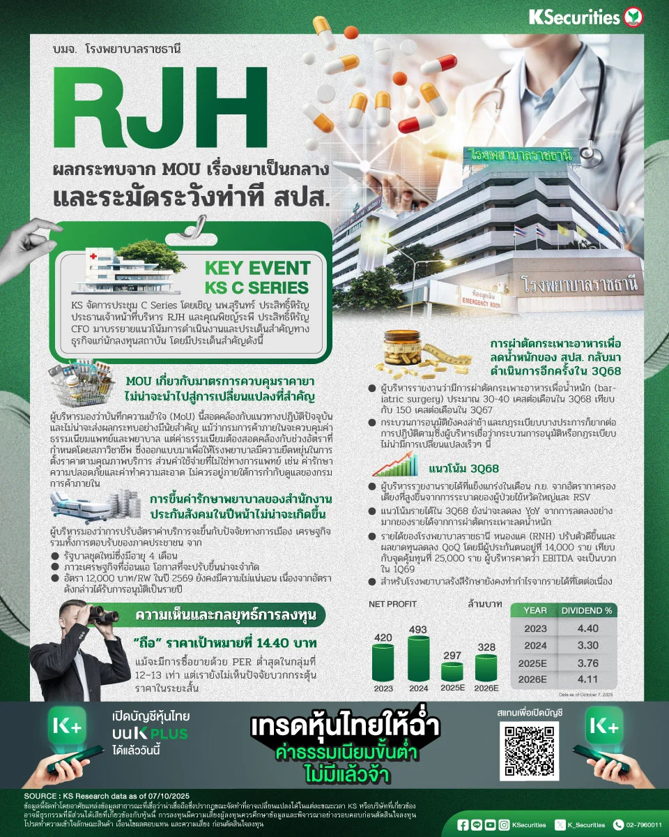 • คงคำแนะนำ “ถือ” ผู้บริหารคาดผลกระทบจำกัดจาก MoU เรื่องการควบคุมราคายา และมีมุมมองระมัดระวังต่อกฎระเบียบของ สปส. แม้การดำเนินงานของโรงพยาบาลใหม่มีแนวโน้มดีขึ้นเรื่อยๆ แต่รายได้และกำไรไตรมาส 3/2568 น่าจะได้รับแรงกดดันจากจำนวนเคสผ่าตัดกระเพาะลดน้ำหนักที่ลดลง โดยคาดว่ากำไรจะกลับมาเติบโตอย่างแข็งแกร่ง YoY ในไตรมาส 4/2568 จากฐานที่ต่ำ