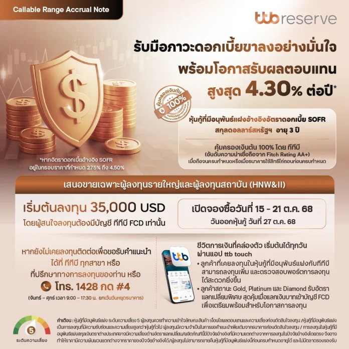 นางสาวบุษรัตน์ เบญจรงคกุล รองประธานเจ้าหน้าที่บริหาร หัวหน้าธุรกิจตลาดเงินและธุรกรรมระหว่างประเทศ ทีเอ็มบีธนชาต กล่าวว่า “เพื่อเป็นอีกหนึ่งทางเลือกของการลงทุนในช่วงที่อัตราดอกเบี้ยมีแนวโน้มปรับลดลง ทำให้โอกาสการรับผลตอบแทนจากตราสารหนี้หรือดอกเบี้ยเงินฝากลดลง นักลงทุนจึงมองหาทางเลือกที่มีโอกาสได้รับผลตอบแทนที่มากกว่า ธนาคารจึงเตรียมเสนอขาย “หุ้นกู้ที่มีอนุพันธ์แฝง”ประเภท Callable Range Accrual Note อ้างอิงอัตราดอกเบี้ย SOFR สกุลดอลลาร์สหรัฐฯ ระดับความเสี่ยง 5  โอกาสรับผลตอบแทนสม่ำเสมอสูงสุด 4.30% ต่อปี* เพื่อเป็นอีกทางเลือกที่น่าสนใจในเวลานี้ โดยมีจุดเด่นคือ