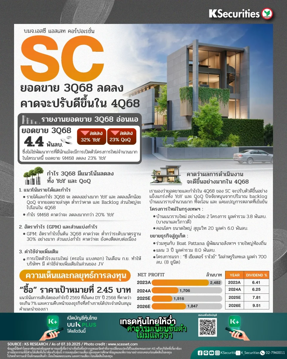 - เรามองว่ายอดขายและกำไรในไตรมาส 4/2568 ของ SC จะปรับตัวดีขึ้นอย่างแข็งแกร่งทั้ง YoY และ QoQ นอกเหนือจากโครงการที่เปิดตัวในไตรมาส 3/2568 ที่กล่าวไปก่อนหน้านี้แล้ว SC ยังมีแผนเปิดตัวโครงการบ้านแนวราบใหม่อย่างน้อย 2 โครงการ มูลค่ารวม 3.8 พันลบ. ในพื้นที่บางนาและวิภาวดี และโครงการคอนโดฯ ขนาดใหญ่ที่สุขุมวิท 20 มูลค่ารวม 6.0 พันลบ. การขยายธุรกิจไปภูเก็ตที่เพิ่งประกาศเมื่อเร็วๆ นี้ (ร่วมทุนกับ Boat Pattana ซึ่งเป็นผู้พัฒนาอสังหาริมทรัพย์รายใหญ่ในท้องถิ่น) จะทำให้ผลประกอบการในไตรมาส 4/2568 น่าตื่นเต้นยิ่งขึ้น
