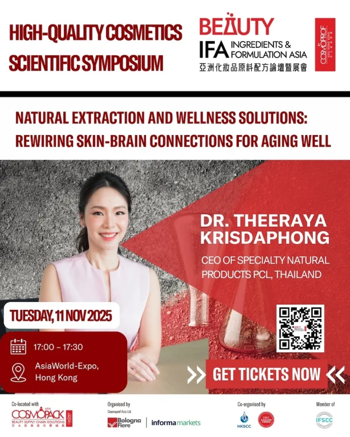 วงการบิวตี้เอเชียเตรียมคึกคักอีกครั้งในเดือนพฤศจิกายนนี้ เมื่อมีข่าวดีว่า ดร.ธีรญากฤษฎาพงษ์ CEO หญิงคนเก่งแห่ง บมจ.สเปเชี่ยลตี้ เนเชอรัล โปรดักส์ จะขึ้นเวทีใหญ่ระดับนานาชาติในงาน BEAUTY IFA (Ingredients & Formulation Asia) ที่จะจัดขึ้น ณ AsiaWorld-Expo ประเทศฮ่องกง งานนี้นับเป็นหนึ่งในเวทีสำคัญของวงการเครื่องสำอางและนวัตกรรมความงาม ที่รวบรวมผู้เชี่ยวชาญจากทั่วโลกมาแลกเปลี่ยนองค์ความรู้ทางวิทยาศาสตร์เครื่องสำอางและสารสกัดธรรมชาติ