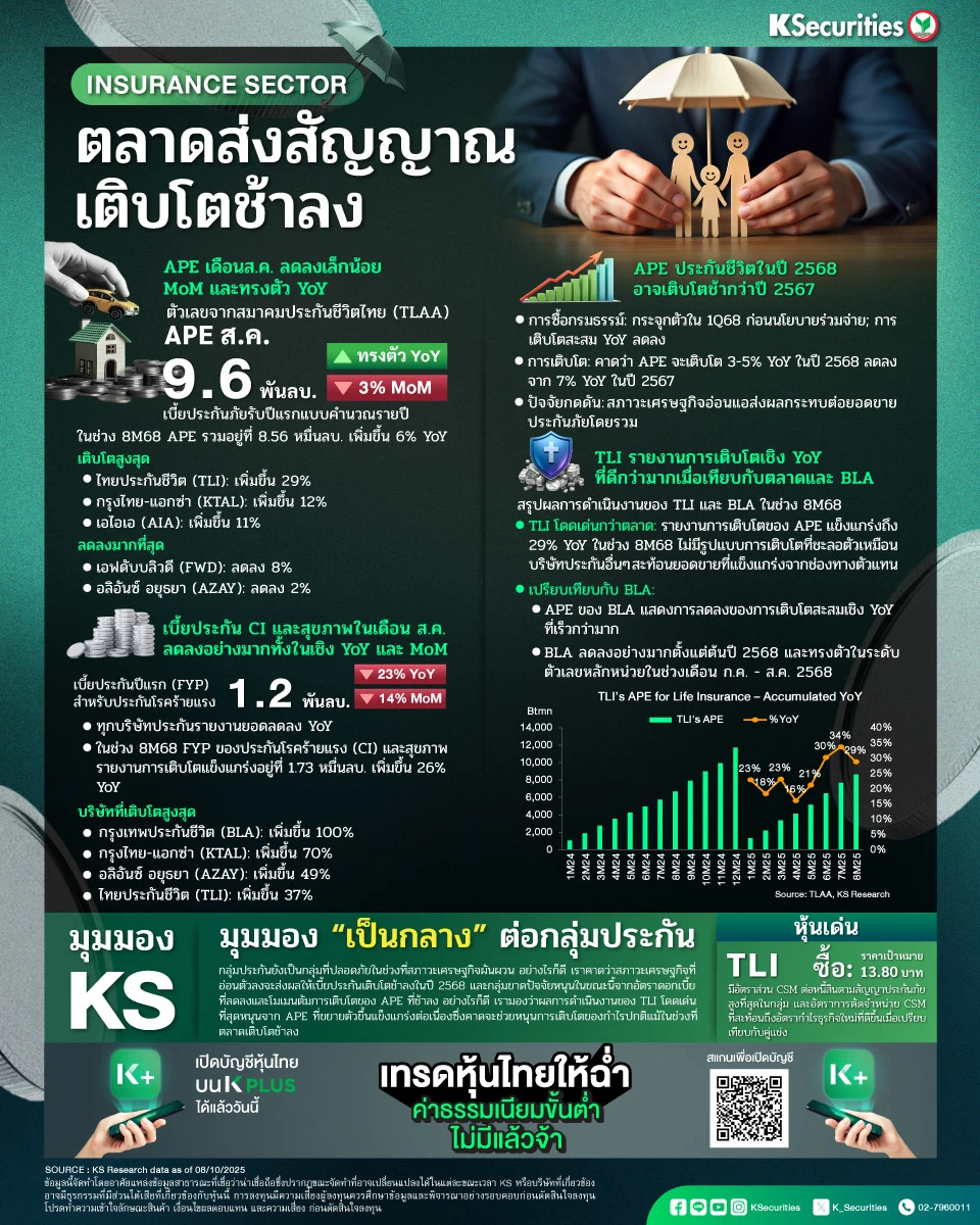 - สมาคมประกันชีวิตไทย (TLAA) รายงานว่าเบี้ยประกันภัยปีเทียบเท่า (APE) รวมของประเทศไทยในเดือนส.ค. อยู่ที่ 9.6 พันลบ. ลดลง 3% MoM แต่ทรงตัว YoY ในช่วง 8 เดือนแรกของปี 2568 APE รวมอยู่ที่ 8.56 หมื่นลบ. เพิ่มขึ้น 6% YoY บริษัท ไทยประกันชีวิต จำกัด (มหาชน) (TLI) รายงานการเติบโตของ APE แข็งแกร่งที่สุด โดยเพิ่มขึ้น 29% YoY ตามด้วย บริษัท กรุงไทย-แอกซ่า ประกันชีวิต จำกัด (มหาชน) (KTAL) เพิ่มขึ้น 12% และบริษัท เอไอเอ (ประเทศไทย) จำกัด (AIA) เพิ่มขึ้น 11% อย่างไรก็ดี บริษัท เอฟดับบลิวดี ประกันชีวิต จำกัด (มหาชน) (FWD) รายงานยอดลดลงมากที่สุด YoY โดยลดลง 8% ตามด้วย บริษัท อลิอันซ์ อยุธยา ประกันชีวิต จำกัด (มหาชน) (AZAY) ที่ลดลง 2%