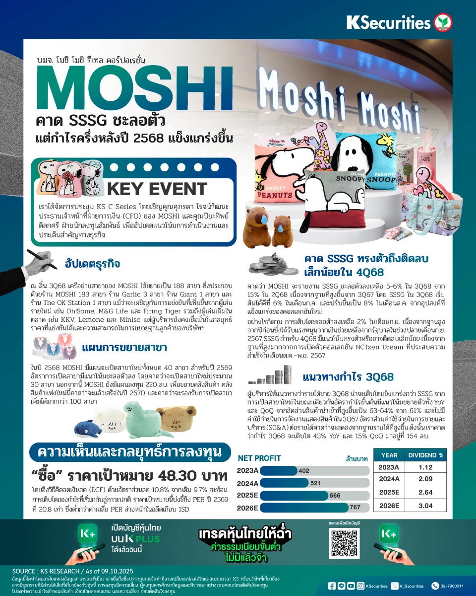 • คาดว่า MOSHI จะรายงาน SSSG ชะลอตัวลงเหลือ 5-6% ในไตรมาส 3/2568 จาก 15% ในไตรมาส 2/2568 เนื่องจากฐานที่สูงขึ้นจากไตรมาส 3/2567 โดย SSSG ในไตรมาส 3/2568 เริ่มต้นได้ดีที่ 6% ในเดือนก.ค. และปรับขึ้นเป็น 8% ในเดือนส.ค. จากอุปสงค์ที่แข็งแกร่งของคอลเลกชันใหม่ อย่างไรก็ตาม การเติบโตชะลอตัวลงเหลือ 2% ในเดือนก.ย. เนื่องจากฐานสูงจากปีก่อนซึ่งได้รับแรงหนุนจากเงินช่วยเหลือจากรัฐบาลในช่วงปลายเดือนก.ย. 2567 SSSG สำหรับไตรมาส 4/2568 มีแนวโน้มทรงตัวหรืออาจติดลบเล็กน้อย เนื่องจากฐานที่สูงมากจากการเปิดตัวคอลเลกชัน NCTzen Dream ที่ประสบความสำเร็จในเดือนต.ค.–พ.ย. 2567