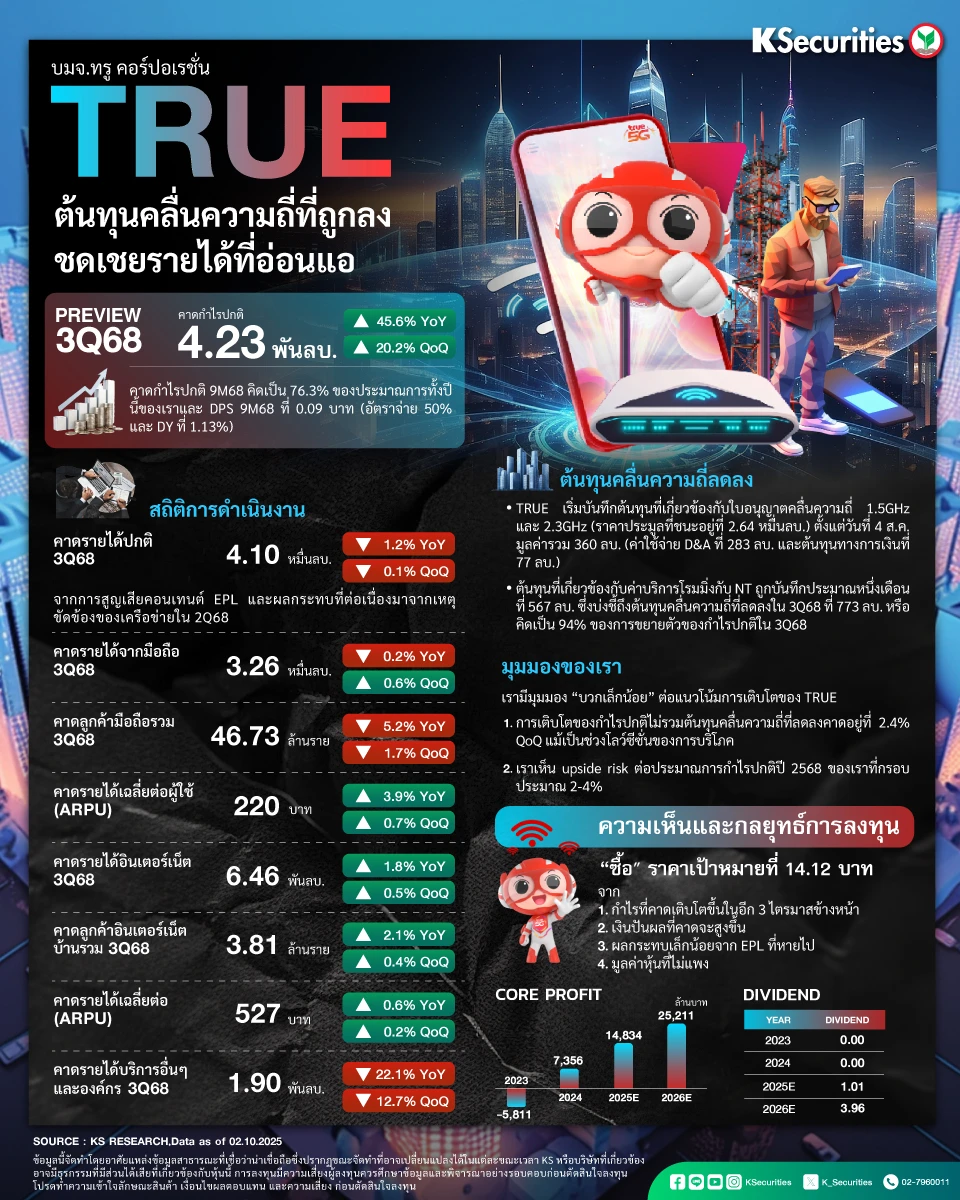 - TRUE มีกำหนดรายงานงบการเงินไตรมาส 3/2568 ในวันที่ 4 พ.ย. และจะจัดการประชุมนักวิเคราะห์ในวันที่ 5 พ.ย. เราคาดว่า TRUE จะรายงานกำไรสุทธิที่ 2.85 พันลบ. หากไม่รวมรายการครั้งเดียว เช่น ผลขาดทุนจาก FX, รายได้ภาษีและค่าด้อยสินทรัพย์ คาดกำไรปกติอยู่ที่ 4.23 พันลบ. เพิ่มขึ้น 45.6% YoY และ 20.2% QoQ หนุนจากต้นทุนการผนึกกำลังจากการรวมกิจการและต้นทุนคลื่นความถี่ที่ลดลง ประมาณการกำไรปกติ 9 เดือนแรกปีนี้ของเราเท่ากับ 76.3% ของประมาณการกำไรปกติทั้งปีนี้ของเรา นอกจากนี้ เรายังคาดว่า TRUE จะประกาศ DPS 9 เดือนแรกปีนี้ที่ 0.09 บาท หรือเท่ากับ 50% ของกำไรสุทธิ 9 เดือนแรกปีนี้และมีอัตราตอบแทนเงินปันผลที่ 1.13%