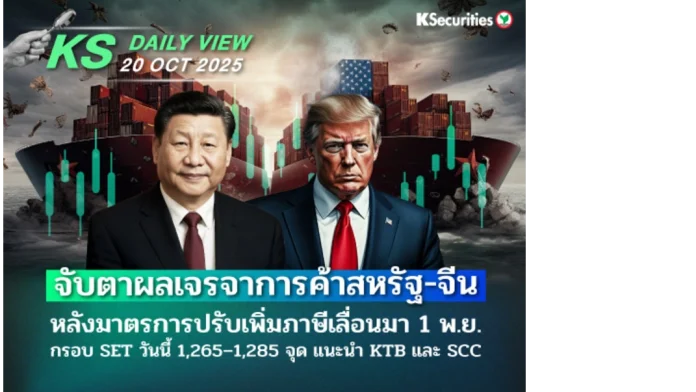 KS Daily View 20.10.2025 >>> จับตาผลเจรจาการค้าสหรัฐ-จีน หลังมาตรการปรับเพิ่มภาษีเลื่อนมา 1 พ.ย. กรอบ SET วันนี้ 1,265–1,285 จุด แนะนำ KTB และ SCC