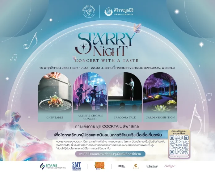 กองทุน Hope for Sarcoma ภายใต้ศิริราชมูลนิธิ ขอเชิญทุกท่านร่วมแบ่งปันความหวังผ่านกิจกรรมการกุศล “Starry Night Concert with a Taste: A Story of Hope” ค่ำคืนสุดพิเศษที่ผสาน ดนตรี ศิลปะ และอาหารระดับ Chef Table เข้าไว้ด้วยกัน ในวันเสาร์ที่ 15 พฤศจิกายน 2568 เวลา 17.00 – 22.00 น. ณ Rarin Riverside Bangkok (พระราม 3)