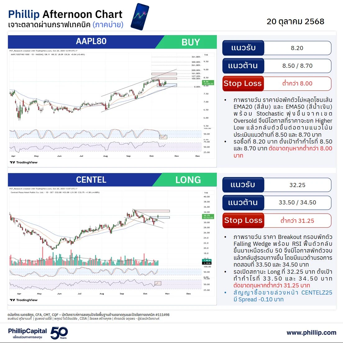 หุ้นแนะนำบ่ายนี้ AAPL80, CENTEL (Long)