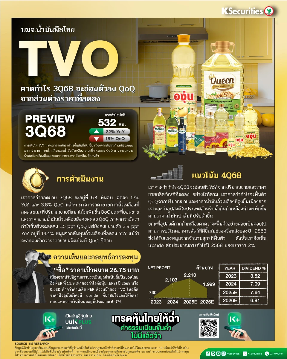 - เราคาดว่า TVO จะรายงานกำไรไตรมาส 3/2568 ที่ 532 ลบ. เพิ่มขึ้น 22% YoY แต่ลดลง 18% QoQ การเติบโต YoY น่าจะมาจากอัตรากำไรขั้นต้นที่เพิ่มขึ้น เนื่องจากต้นทุนถั่วเหลืองลดลงมากกว่าราคากากถั่วเหลืองและน้ำมันถั่วเหลือง ขณะที่การลดลง QoQ มาจากยอดขายน้ำมันถั่วเหลืองที่ลดลงและราคาขายกากถั่วเหลืองที่อ่อนตัว กำไร 9 เดือนแรกของปี 2568 คิดเป็น 77.5% ของประมาณการกำไรปี 2568 ของเรา