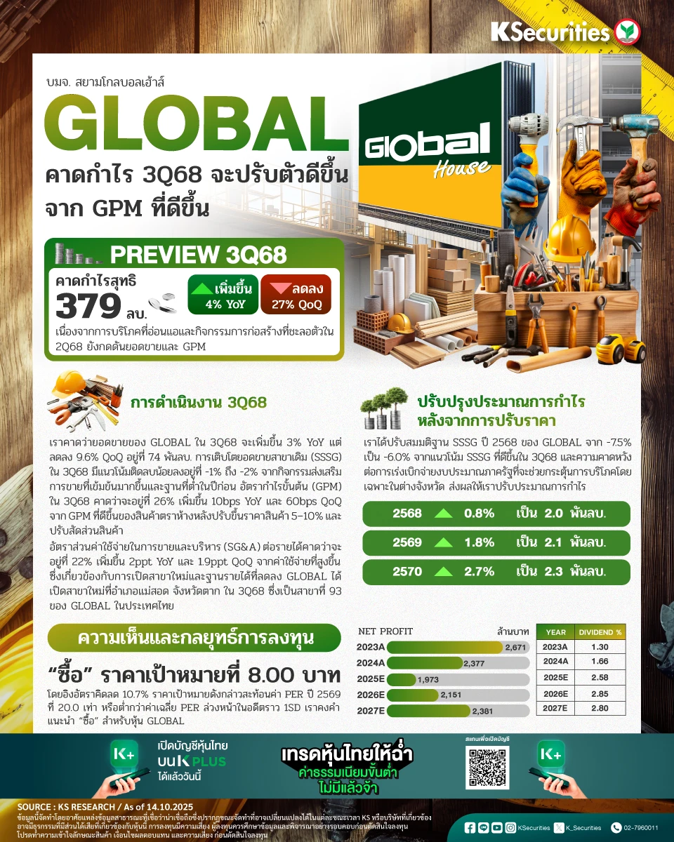GLOBAL คาดกำไร 3Q68 จะปรับตัวดีขึ้นจาก GPM ที่ดีขึ้น