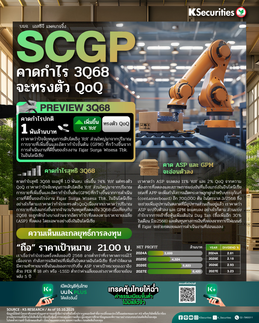 - มุมมอง KS : คงคำแนะนำ “ถือ” SCGP และราคาเป้าหมายเดิมที่ 21.00 บาท เราเชื่อว่ากำไรช่วงครึ่งหลังของปี 2568 อาจต่ำกว่าที่เราคาดการณ์ไว้ เนื่องจากกำลังการผลิตใหม่ที่เพิ่มขึ้นในตลาดอินโดนีเซีย ซึ่งทำให้ตลาดมีความท้าทายมากขึ้นในแง่ของการปรับขึ้น ASP ราคาเป้าหมายของเราอิงด้วย PER ที่ 18 เท่า หรือ -1.5SD ต่ำกว่าค่าเฉลี่ยของช่วงราคาซื้อขายย้อนหลัง 5 ปี