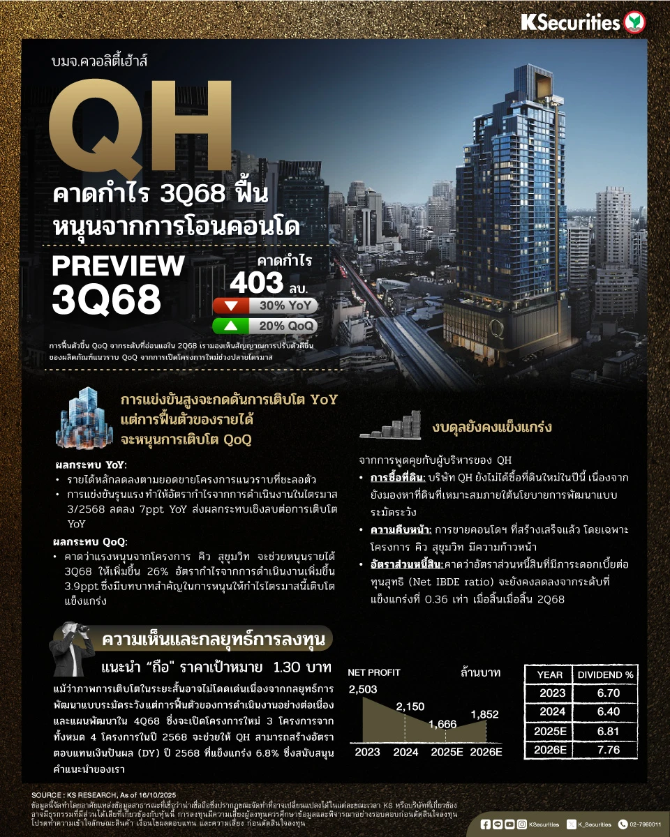 QH คาดกำไร 3Q68 ฟื้น หนุนจากการโอนคอนโด
