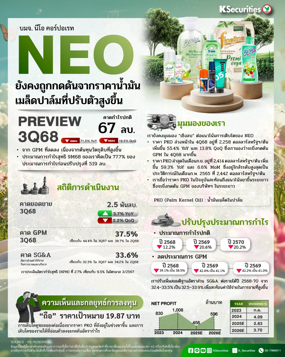 - แนะ “ถือ” สำหรับ NEO แต่ปรับลดราคาเป้าหมายสิ้นปี 2569 ลงเหลือ 19.87 บาท จากเดิมที่ 21.18 บาท จากการปรับลดประมาณการกำไรของเรา เรามองว่าแนวโน้มการเติบโตของบริษัทฯ ดูไม่สดใสจากราคา PKO ที่อยู่ในทิศทางขาขึ้น และรายได้ที่เติบโตในอัตราชะลอตัว ท่ามกลางแรงกดดันทางเศรษฐกิจซึ่งไม่เพียงพอที่จะชดเชยต้นทุนคงที่เพิ่มเติม เช่น ค่าเสื่อมราคาและดอกเบี้ยจ่าย ทั้งนี้ หากยังไม่มีสัญญาณที่ชัดเจนว่าราคา PKO จะกลับเข้าสู่ขาลง เราเชื่อว่าแรงขับเคลื่อนเชิงบวกในระยะ