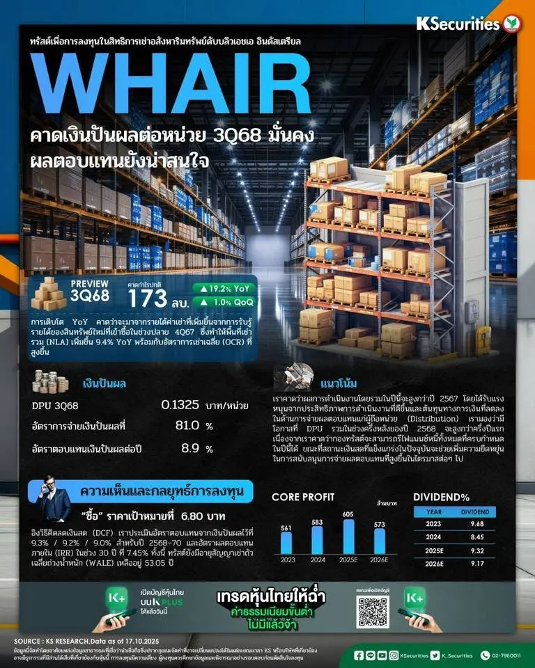 WHAIR คาดเงินปันผลต่อหน่วย (DPU) 3Q68 มั่นคง ผลตอบแทนยังน่าสนใจ