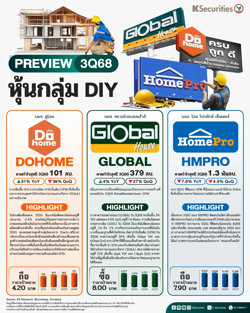 - คาดว่ากำไรปกติในไตรมาส 3/68 จะทรงตัว YoY แต่ลดลง 28% QoQ เนื่องจากการบริโภคที่อ่อนแอและกิจกรรมการก่อสร้างที่ชะลอตัวในไตรมาส 2/68 ยังกดดันยอดขายและ GPM