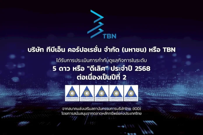 บริษัท ทีบีเอ็น คอร์ปอเรชั่น จำกัด (มหาชน) หรือ TBN ได้รับคะแนนการประเมินการกำกับดูแลกิจการบริษัทจดทะเบียน (Corporate Governance Report: CGR) ประจำปี 2568 ในระดับ 5 ดาว หรือ “ดีเลิศ” (Excellent CG Scoring) ต่อเนื่องเป็นปีที่ 2  สำหรับปี 2568 มีบริษัทจดทะเบียนเข้าร่วมการประเมินทั้งสิ้น 844 บริษัท โดยมีบริษัทที่ได้รับการประเมินในระดับ “ดีเลิศ” รวมทั้งสิ้น 373 บริษัท
