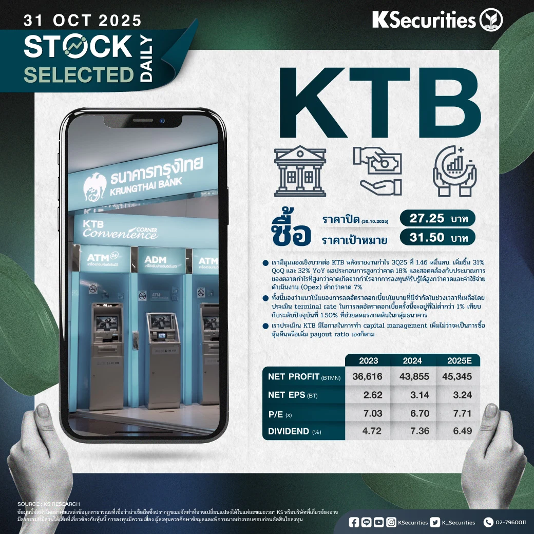 • KTB: กำไร 3Q25 เพิ่มขึ้น 31% QoQ และ 32% YoY สูงกว่าคาด 18%