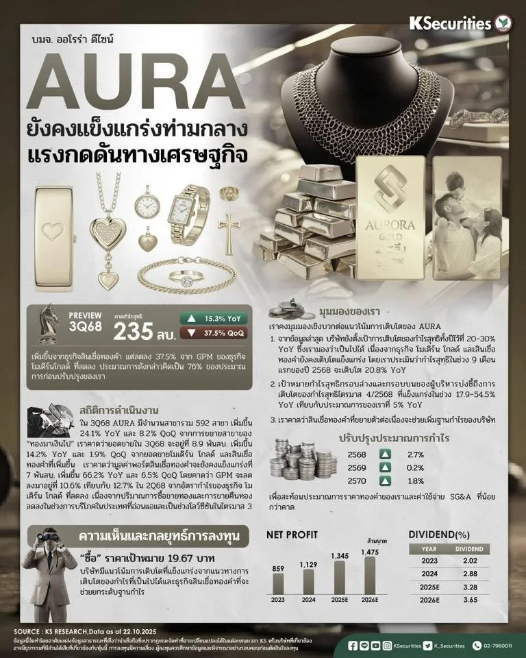 AURA หุ้นทองยังคงแข็งแกร่งท่ามกลางแรงกดดันทางเศรษฐกิจ คาดกำไรปกติ 3Q68 ที่ 235 ลบ. +15% YoY จากธุรกิจสินเชื่อทองคำ -37.5% จาก GPM ธุรกิจโมเดิร์นโกลด์ที่ลดลงปรับเพิ่มประมาณการกำไรปกติขึ้นเล็กน้อย ปี 68 2.7%/ปี 69 0.2% /ปี 70 1.8% ปรับเพิ่ม TP สิ้นปี 69 ขึ้น 0.3% เป็น 19.67 บาท